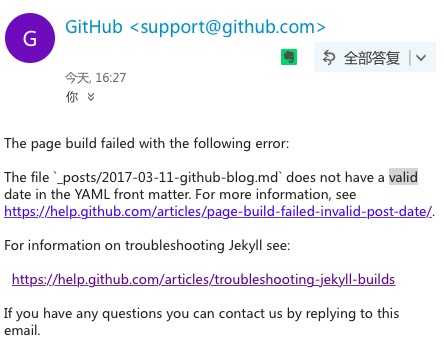 新手搭建博客的时候肯定会遇到各种问题,阿杰鲁,记得查看自己的邮箱,一般的错误github都会发邮件提示你,比如这篇博客刚试了半天怎么也传不上去,后来才想到去邮箱看一下,果然github早就发邮件提示日期格式不对。